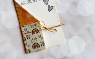 Dafür habe ich die Strohhalmbox benutzt. Ich habe die Form mit Craftpapier ausgestanzt und auf die vordere Seite noch zusätzlich ein Herz ausgestanzt und es mit Keramikpapier beklebt.