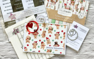 Für die „Deko“ habe ich folgende Stempelsets verwendet: Felix „Glücklich“, Winterliche Grüße, Fuchs und Felix & Luke mini. Die Weihnachtsmütze ist aus dem Stempelset Bärige Weihnachtsgrüße. Um die Mütze auch noch in einer gespiegelten Version nutzen zu können, habe ich zunächst auf einen Acrylblock gestempelt und damit dann auf Papier. Der Abdruck ist dann etwas blasser, fällt aber coloriert kaum noch auf.