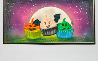 Zum Schluss stempelte ich noch einen Text auf einen Rest CS kürbis, mattete ihn mit schwarzem CS und klebte ihn mit Abstandspads auf. Jetzt mattete ich, ebenfalls mit schwarz, den Aufleger und klebte ihn auf den Kartenrohling.