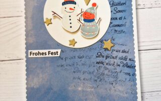 Für die beiden Abdrücke habe ich wieder das Stempelkissen „Pale Turquois“ verwendet. Und damit der Hintergrund nicht so langweilig ist, bekam dieser auch noch einige Spritzer der verdünnten Farbe ab. Verdünnt habe ich die Stempelfarbe mit Wasser, so wie immer.