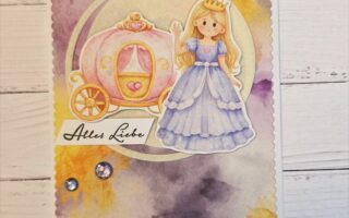 Die Karte ist recht schnell gewerkelt. Zuerst habe ich das Designpapier auf ein dickeres Papier aufgeklebt und mit der Aufleger Stanze ausgestanzt. Die Blätter, Blüten, die Schrift und den Banner habe ich ebenso ausgestanzt und die Blüten mit Stickles eingefärbt. Die Schrift „Alles Gute“ habe ich mit verschiedenen Sprays aus dem Fundus eingefärbt. Dazu habe ich ein Zewa mit den Farben besprüht und die Schrift dort immer wieder drauf gedrückt. Die Blüten habe ich mir noch etwas zurecht gebogen und alle Teile aufgeklebt. Zum Schluss hat meine Karte noch zwei Steinchen zur Deko erhalten.
