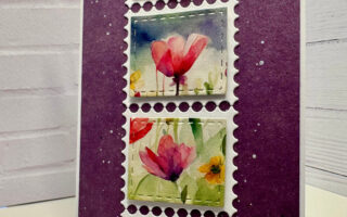 Vorher hat sie sich den Kartenrohling aus dem Cardstockpapier „Recycling Natur“ und dem Designpapier „Aquarellblütenwiese“ (ausgestanzt mit dem „Aufleger Bütten A6“ ) ausgesucht. Auf den Aufleger mussten dann auch noch „hoppelige“ und „fröhliche“ Grüße gestempelt werden.