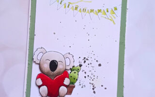Rechts ist eine kleine Karte in die große Karte geklebt. Für den kleinen Kartenrohling habe ich mit den Cardstock „Waldbeere“ verwendet. Bei dem Aufleger musste ich ein wenig tricksen, da keine meiner Stanzen so richtig passte (entweder zu klein oder zu groß). Dafür habe ich die kleinere Stanze aus dem Set „Aufleger A6 mit Fenster“ verwendet und dann den ausgestanzten Aufleger angepasst. Auch auf dieser Karte habe ich zwei Luftballons aufgeklebt und mit den Zahlen „55“ („Jubiläums Zahlen“) dekoriert.