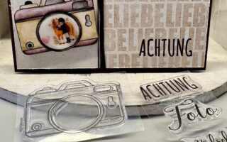 Die beiden Aufleger „Wellenrand“ und den kleineren Rahmen des „Auflegers A6 mit Fenster“ habe ich aufeinander geklebt und dann erst bestempelt. Der Baum, aus dem Stempelset „Aufrichtige Anteilnahme“ habe ich in Schwarz gestempelt