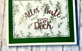 Stellt man die Karte auf, ziert auch hier das schöne Designpapier die Karte. Diesmal habe ich es aber mit dem Schneidebrett zugeschnitten. Das „Gute Besserung“ habe ich je an zwei dünne Drähte befestigt und an den Steg für den 3D- Effekt geklebt.