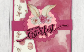 Ihr braucht aus dem weißen Cardstock eine Grundkarte im Maß 14,85 x 10,5 cm. Dann einen Aufleger im Maß 16,1 x 10,5 (lange Seite falzen bei 3,8/7,6 cm). Lila Mattung 8,1 x 10 cm. DSP 2,5 x 10 cm (2x), 7,1 x 9,5 cm (1x). Ich habe das DSP auf 10 cm Höhe gekürzt, dann die Streifen 2,5 dann 7,1 und noch einmal 2,5 abgeschnitten. Das mittlere Teil oben und unten noch einmal um 2,5mm gekürzt.