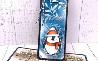 Jetzt nahm ich mir eins der neuen Stempelsets, die demnächst im Shop erscheinen. Ich stempelte alles Ton in Ton auf das Lesezeichen, einen Text, Blumen und kleine Blüten und Blätter. Die Blumen und Blätter colorierte ich noch mit Aquarellsriften. Zum Schluss machte ich oben noch ein Loch und befestigte ein romantisches Zierband dran.