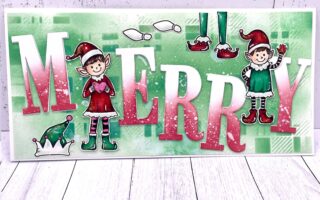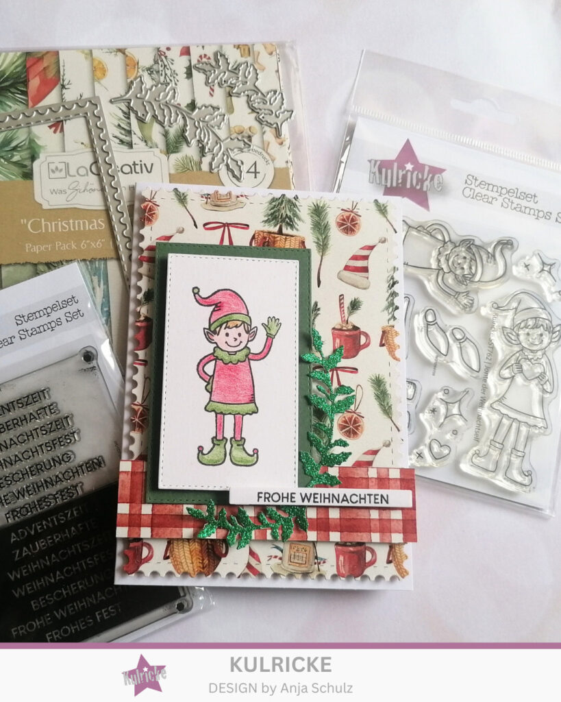 Dann stanzte ich 2 Rechtecke aus, Eines größer und in grün, das Andere kleiner und aus Aquarellpapier. Auf das Aquarellpapier stempelte ich den Weihnachtself aus dem Set „Jonte der Weihnachtself“. Diesen süßen Elfen colorierte ich dann mit Aquarellstiften. Die Rechtecke kamen linksbündig auf die Karte. Dann stempelte ich noch einen Spruch aus dem Set „Weihnachtszeit Label“ und stanzte ihn mit der Form „Text Label“ aus. Den Spruch setzte ich dann auf den karierten Streifen.
