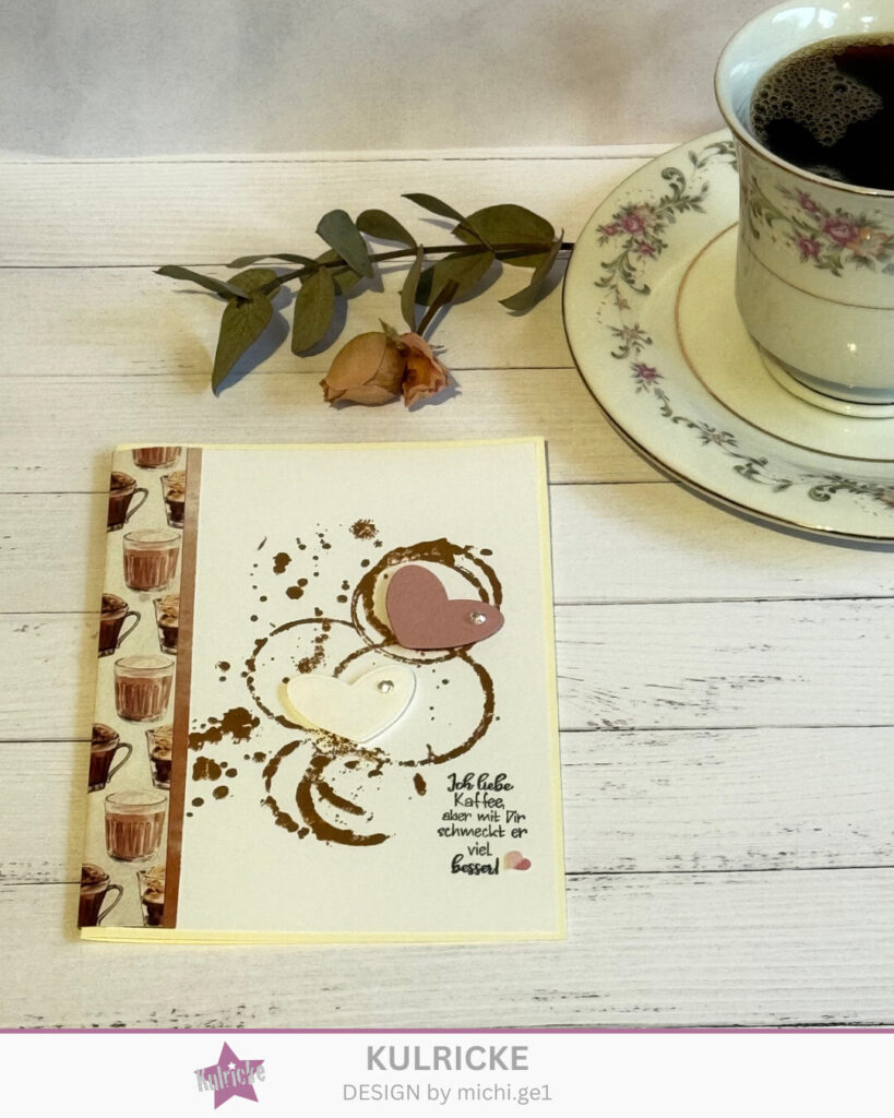 Mit brauner Stempelfarbe die Kaffeeflecken und mit schwarzer den Text auf die Klappkarte stempeln.