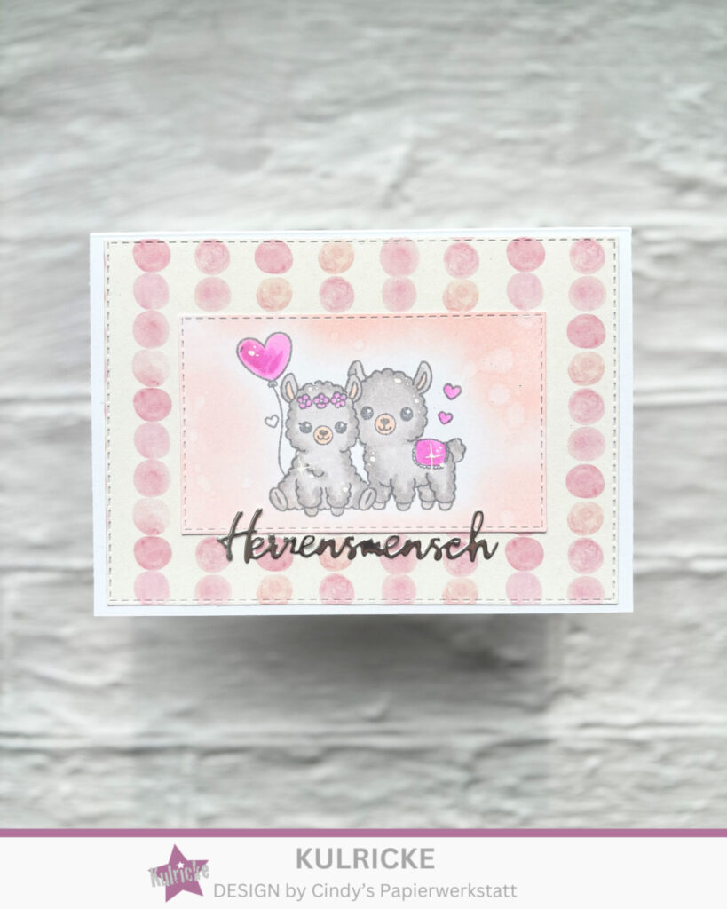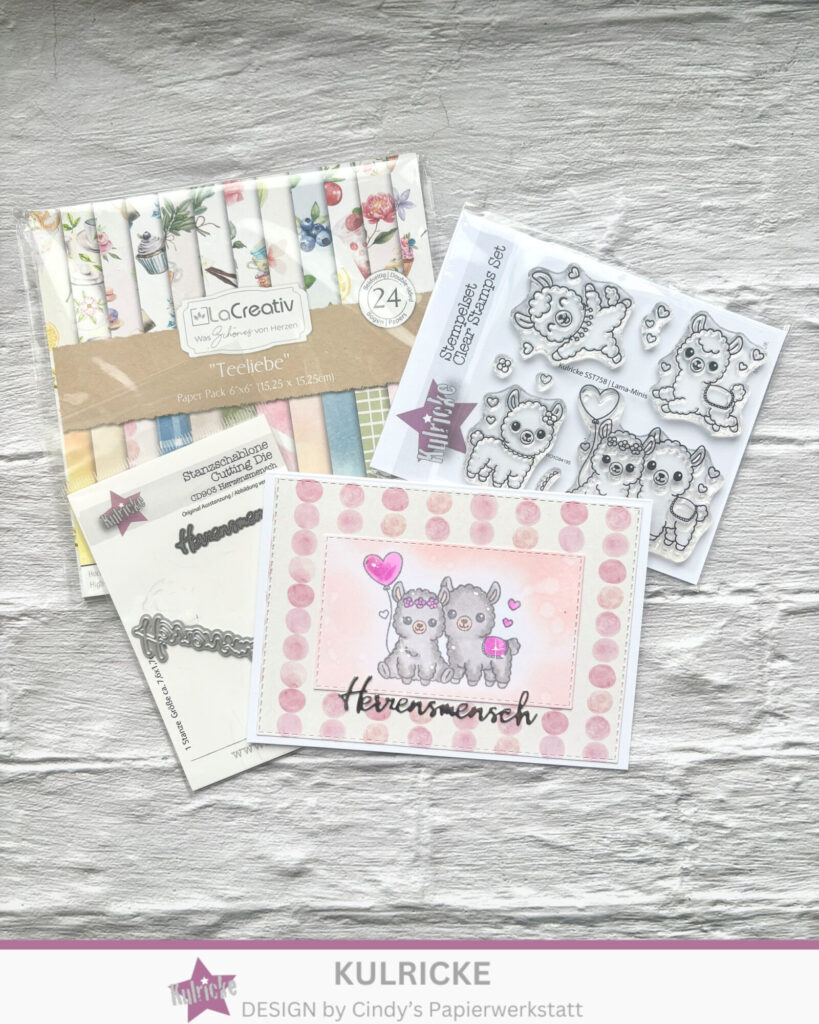 Für den größeren Aufleger habe ich mir aus dem vielseitigen LaCreativ – Designpapier „Teeliebe“ einen passenden Bogen ausgesucht. Auf den kleineren Aufleger sind die süßen Kulricke Stempel „Lama-Minis“ gelandet. Im Hintergrund habe ich mit Distress Oxide gearbeitet. Komplett wird meine Karte mit dem Schriftzug Kulricke Stanzschablone „Herzensmensch“.
