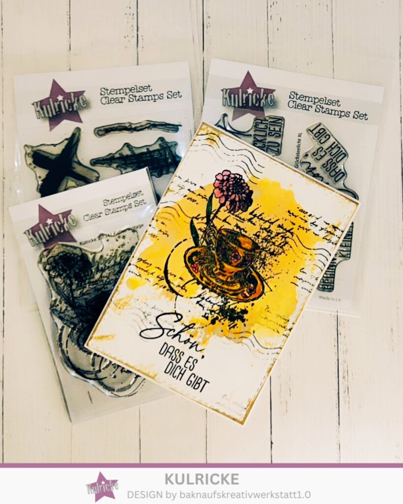 Ihr stanzt euch einen passenden Aufleger für eure Grundkarte (29×10,5 cm, gefalzt an der langen Seite bei 14,5 cm). Nun vermischt ihr eure Oxide Farbe mit Wasser und färbt euch euren Aufleger ein, in der Klecksform. Anschließend sehr gut trocknen lassen. Wenn er trocken ist kann der Stempel Kaffeepoesie aufgestempelt werden, am besten mir einer Stempelhilfe, notfalls könnt ihr damit noch einmal nach stempeln falls der erste Abdruck nicht gut genug geworden ist. Mit den Grunge Stempeln noch ein wenig stempeln und dann den Spruch aus den Glücksteelichtern. Der Aufleger kann auf die Grundkarte aufgeklebt werden. Wer will kann noch ein wenig colorieren.