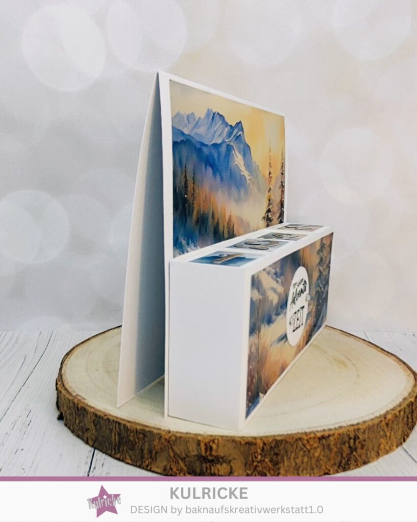 Mit der Stanzschablone Mini Streichholzschachtel vier Schachteln zusammen bauen und dann zusammen kleben. Diese werden Verkleidet mit einem Streifen Cardstock im Maß 5,7x 29,8 cm (falzen bei 4,7/7,5/21,7/24,4 cm). Die verkleideten Schachteln werden auf eine Karte geklebt (24×15 cm, Lange Seite falzen bei 12 cm), offene Seite der Karte zeigt nach unten.