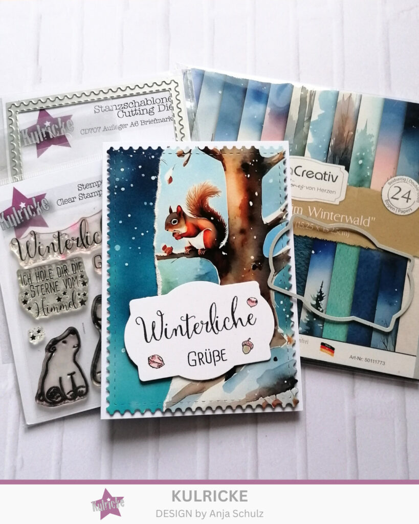 Heute habe ich eine winterliche Karte für euch mit diesem niedlichen Eichhörnchen. Das Motiv ist aus dem Designerpapier „Spaziergang im Winterwald“, wovon ich noch eine Rest hatte. An der linken Seite habe ich einen Rand gerissen.