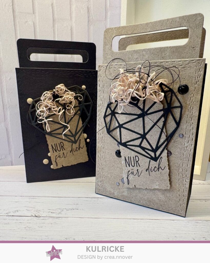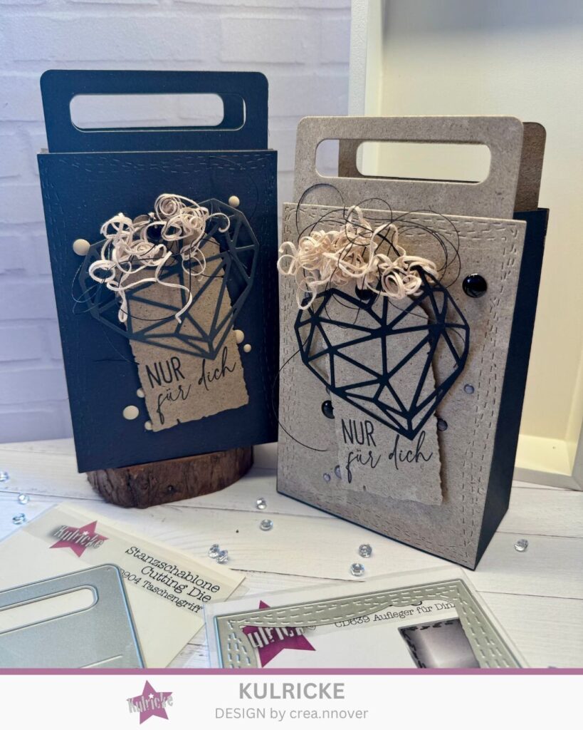 Der Mittelteil wird dann einfach an die Aufleger geklebt und die Taschengriffe eingeklebt. Je nachdem welchen Aufleger ihr nehmt sieht die Tasche immer anders aus.