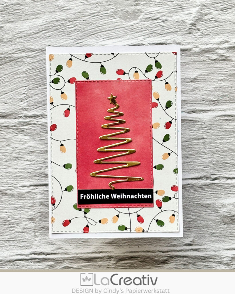 Für meine Aufleger verwende ich zwei farblich passende Bögen aus dem wundervollen LaCreativ – Designpapier „Gemütliche Weihnachtszeit“ ergänzt wird der obere Aufleger mit der tollen Kulricke Stanzschablone „Weihnachtsbaum Filigran“ komplett wird die Karte mit einem der vielfältigen Texte aus Kulricke Designpapier – „Weihnachten“