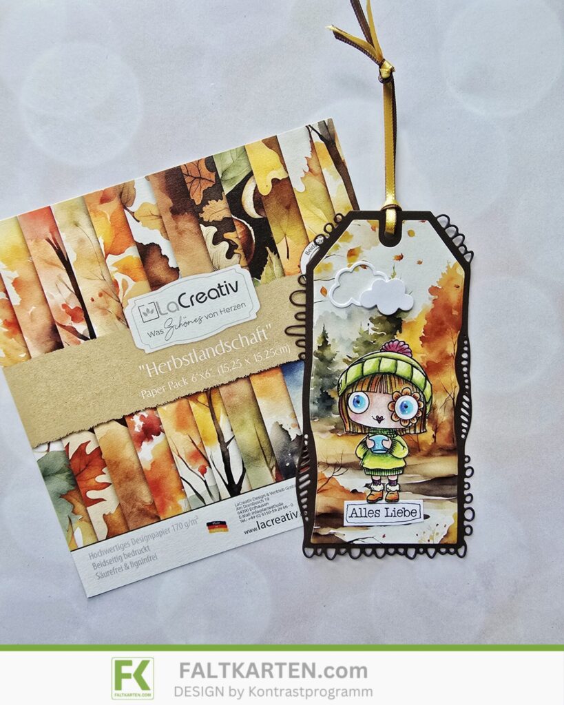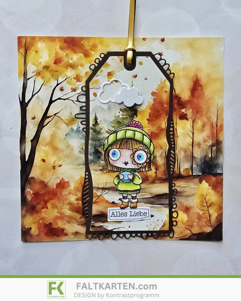 Wie in meinem letzten Beitrag, habe ich erneut das Herbstlandschaft Designpapier für den Hintergrund benutzt und mich für eines der Mädels von Aall & create entschieden.