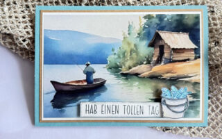 Einige Fische aus dem restlichen Designpapier ausschneiden und mit Klebepads auf die Karte setzen.