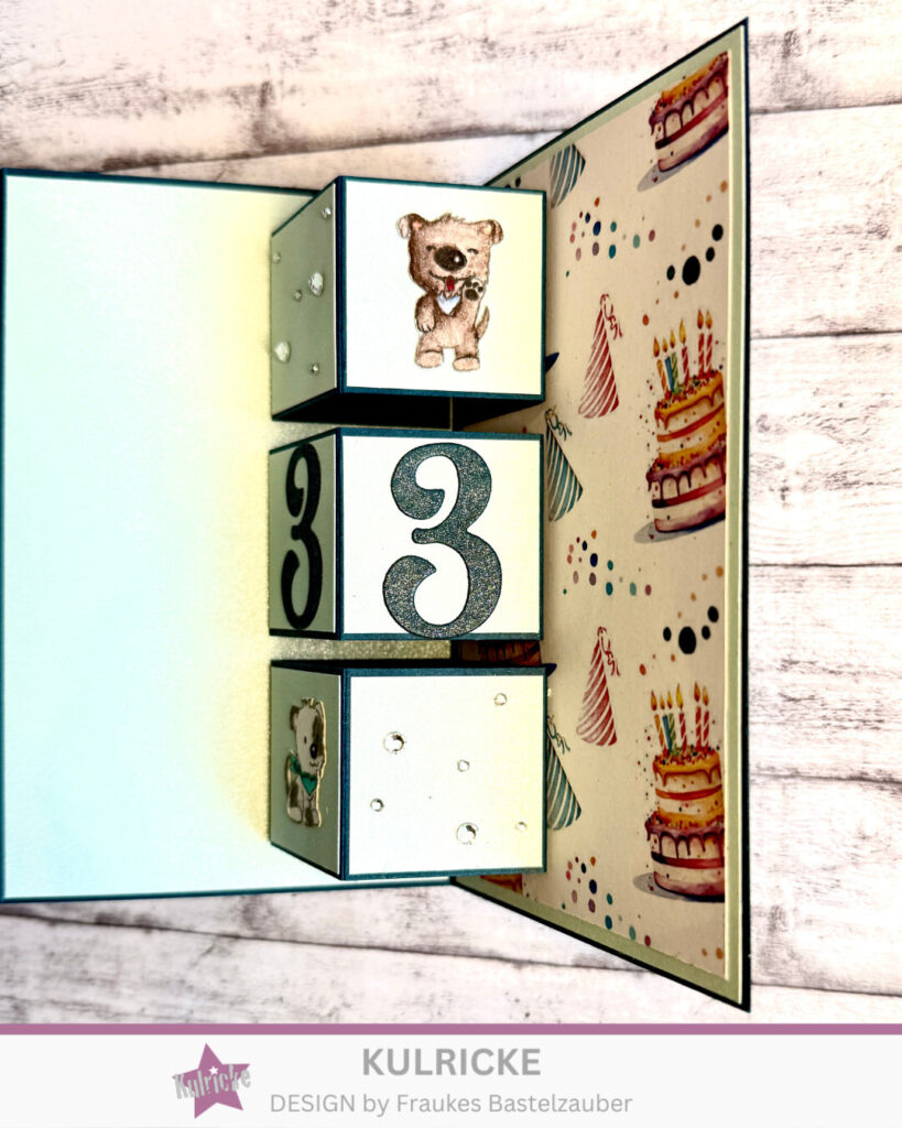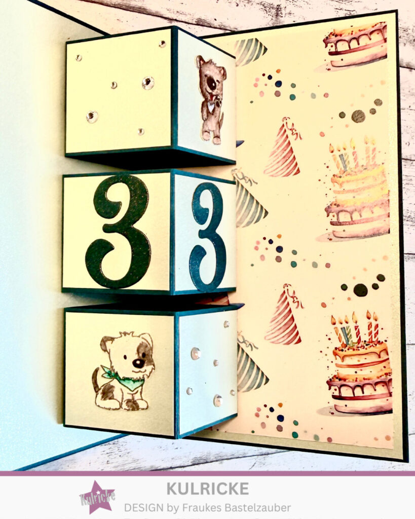 Innen poppen drei Würfel auf. Auf zweien sind die kleinen Hunde (Stempelset „Hunde Minis“, leider nicht mehr lieferbar) und auf den mittleren die 33 (Stanzen „Zahlen Elegant“) aufgeklebt.