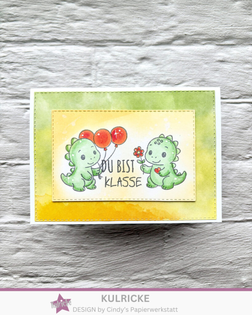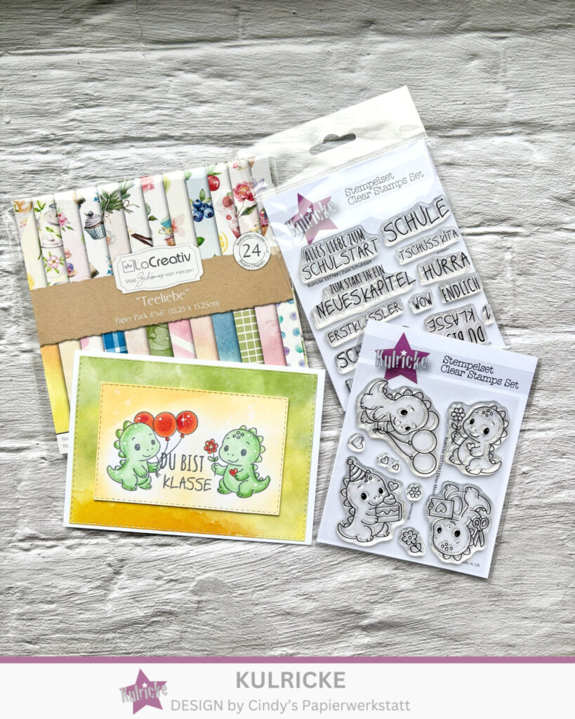 Aus dem vielseitigen LaCreativ – Designpapier „Teeliebe“habe ich mir einen passenden Bogen ausgesucht dieser ist der Hintergrund meiner Karte. Im Vordergrund sind zwei der süßen Dinos aus dem Set Kulricke Stempel „Dino-Minis“ zu finden. Im Hintergrund habe ich mit Distress Oxide gearbeitet. Komplett wir die Karte mit einem Text aus Kulricke Stempel „Zum Schulstart“ auch für andere Gelegenheit wunderbar nutzbar.
