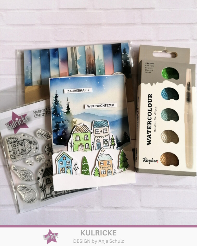 Aus den Stempelsets „Winterhäuschen“ und „Lebkuchenwald“ stempelte ich die Häuschen und ein paar Tannenbäume auf Aquarellpapier. Diese colorierte ich dann mit den super schimmernden „metallic Watercolour Farben“. Die müsst ihr ausprobieren! Die Motive schnitt ich dann aus und riss aus weißem Papier noch etwas Schneeberge. Das Alles verteilte ich dann erhöht und versetzt auf die Karte, sodass es eine wunderschöne Winterlandschaft ergab.
