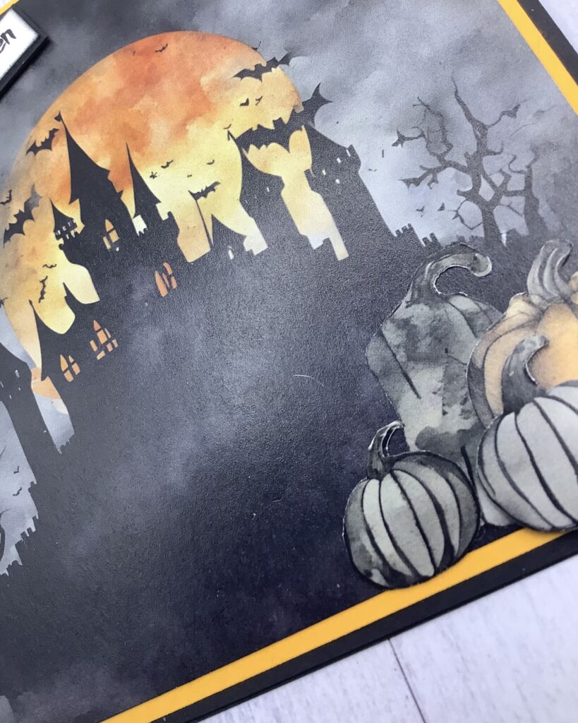 Es ist einfach zum Ende des Jahres zu viel zu tun und ich stelle mit Entsetzen fest, es gab noch nicht wirklich etwas zum Thema Halloween von mir. Das muss dann heute mal schnell nachgeholt werden. Also suchte ich mir das DSP Gruselige Halloween heraus und entschied mich für den Bogen mit der mystischen Burg. Den Bogen schnitt ich auf 13,5 x 13,5 cm zurecht und suchte mir aus 2 anderen Bögen noch Kürbisse aus, die ich dann ausschnitt.