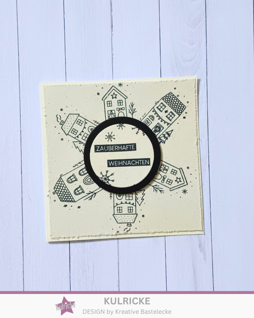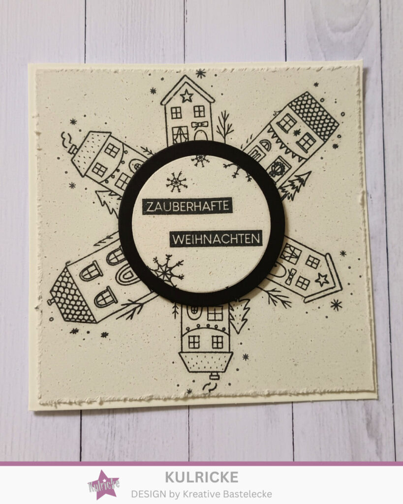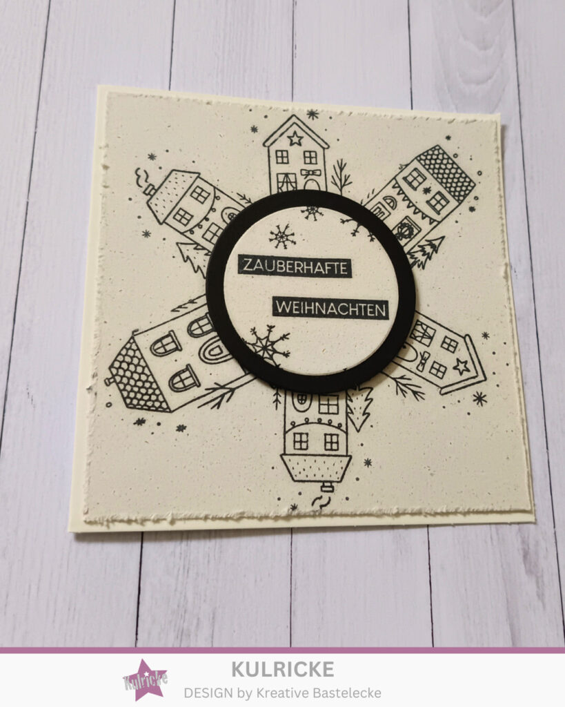 Ich habe danach die Mitte ausgemessen und mit einem Bleistift markiert. Hier habe ich dann das neue Set Winterhäuschen genommen und mit schwarz ringsherum gestempelt (siehe Bild). Dabei habe ich alle Häuschen von dem Set genommen. In der Mitte habe ich dann den einen schwarzen Kreis hergenommen. Darauf kam dann wieder der gleiche Cardstock, den ich auch auf der Karte verwendet habe.