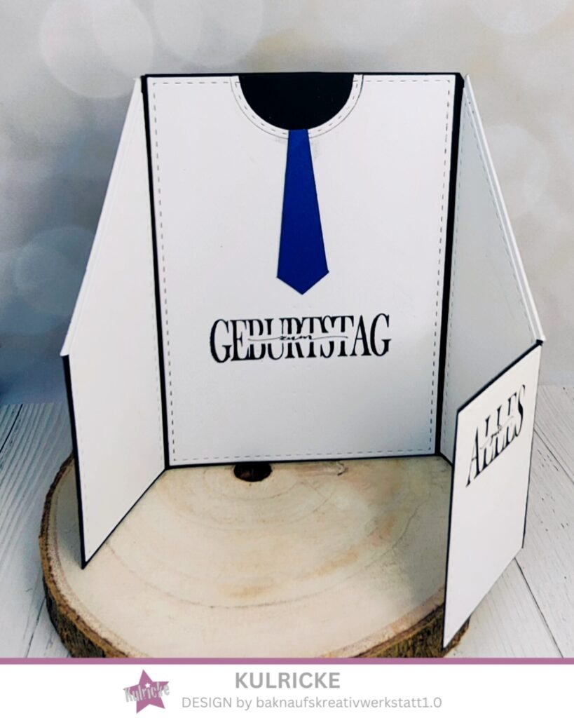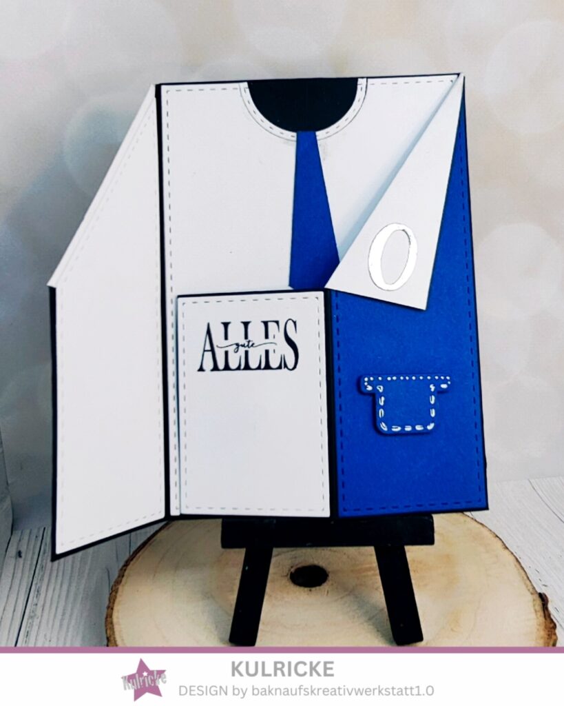 Nun wird alles zusammengeklebt. die weißen Aufleger kommen auf die Innenseiten, ein kleines Rechteck kommt auf die Vorderseite, darunter habe ich ein kleines Magnet geklebt, das Magnet Gegenstück kommt unter die kleine blaue Tasche aus einen blauen Aufleger. Beide blauen Aufleger kommen auf die Grundkarte. Die Zipfel des Hemdes werden mit Abstandpads auf die Vorderseite geklebt. Auf diese Zipfel kommt die 50. Innen wird die Krawatte aufgeklebt. Gestempelt wird auf das äußere kleine weiße Rechteck und innen unter die Krawatte. So das man erst „alles Gute“ und beim umblättern „zum Geburtstag“ lesen kann. Schaut euch einfach die Bilder an, dann versteht ihr was ich meine.