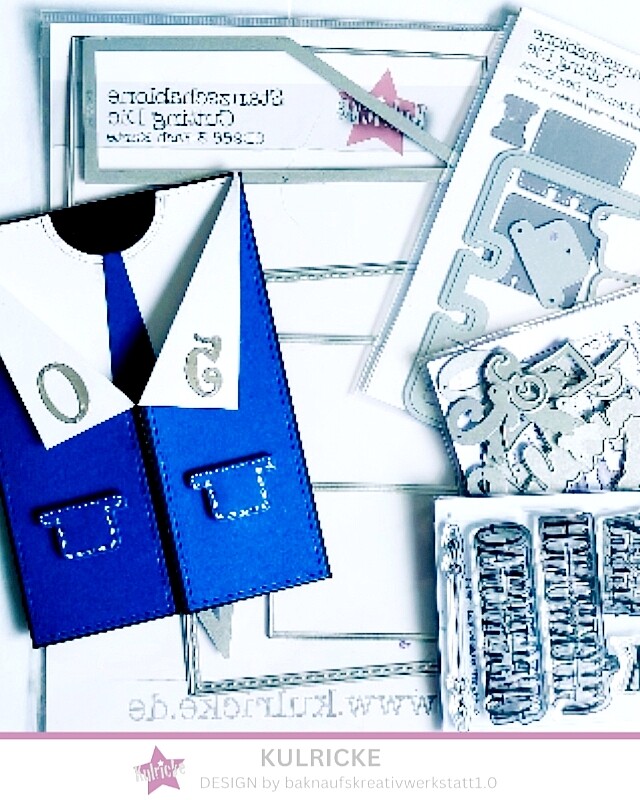 Ihr stanzt aus dem Schwarzen Cardstock die Grundkarte aus, auf der einen Seite wird das kleine Rechteck abgeschnitten (oder nicht mit aus stanzen). Mit der großen rechteckigen Aufleger Stanze einen weißen Aufleger ausstanzen und dort mit einer Kreisstanze einen Halsausschnitt ausstanzen, ebenso in weiß zwei kleine rechteckige Aufleger und zwei spitze Aufleger. Aus weißen Reststücken werden die Hemdzipfel aus geschnitten, ich habe diese Frei Hand geschnitten und um die Kante der Grundkarte gelegt und nur hinten festgeklebt. Jetzt in Königsblau zwei spitze Aufleger für die Vorderseite ausstanzen, aus dem MDC Stanzenset den Aufleger der Reiter zweimal ausstanzen, das werden die Taschen der Security Jacke, aus einen Reststück eine Krawatte ausschneiden.