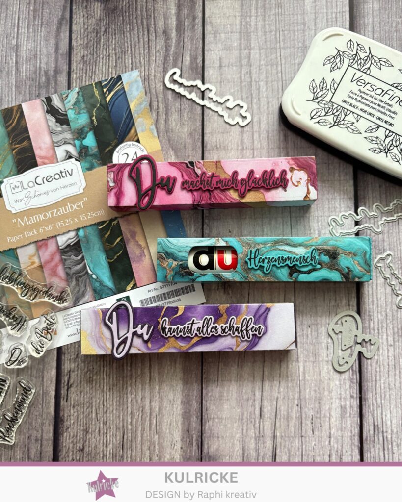 Anschließend habe ich mit den Stanzschablonen „Du bist wundervoll“ Schriftzüge ausgestanzt und mit dem passenden Stempelset bestempelt. Neben den oben genannten Cardstock-Farben kam noch Cardstock in Pastell-Lila und Schwarz zum Einsatz.