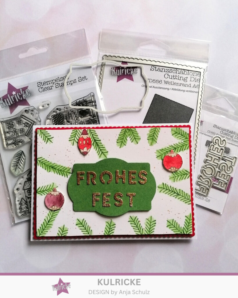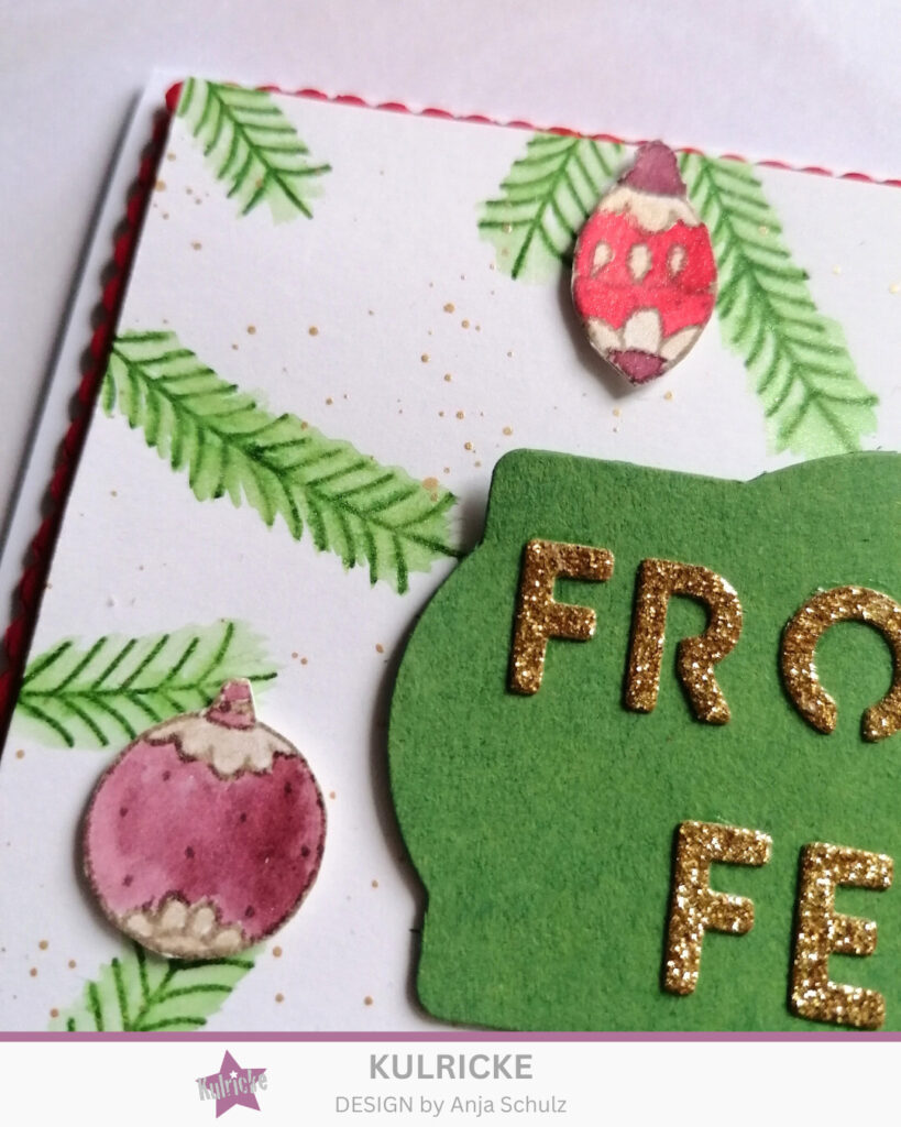 Die Baumkugeln schnitt ich aus und klebte sie an die Zweige auf die Karte. Dann stanzte ich noch ein „Schild“ in grün aus und darauf kam, ausgestanzt in glitzergold mit der Form „Frohes Fest“, ein Spruch. Das Schild setzte ich mittig mit auf die Karte. So kommt man schon jetzt total in Weihnachtsstimmung.