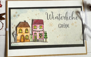 Auf einem Rechteck Aquarellpapier stempelte ich lauter Tannenzweige und auf einem Reststück kleine Baumkugeln aus dem Stempelset „Winterhäuschen“. Mit den Farben „Rayher Watercolour Metallic blaugrün“ colorierte ich die Zweige und Baumkugeln und so funkelten sie ganz toll. Mit dem Metallicgold setzte ich noch lauter Sprenkler auf die Karte.