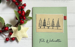 Aus dem grünen bzw. schwarzen Bastelpapier eine Klappkarte herstellen und das Tannenbäumchen stanzen.