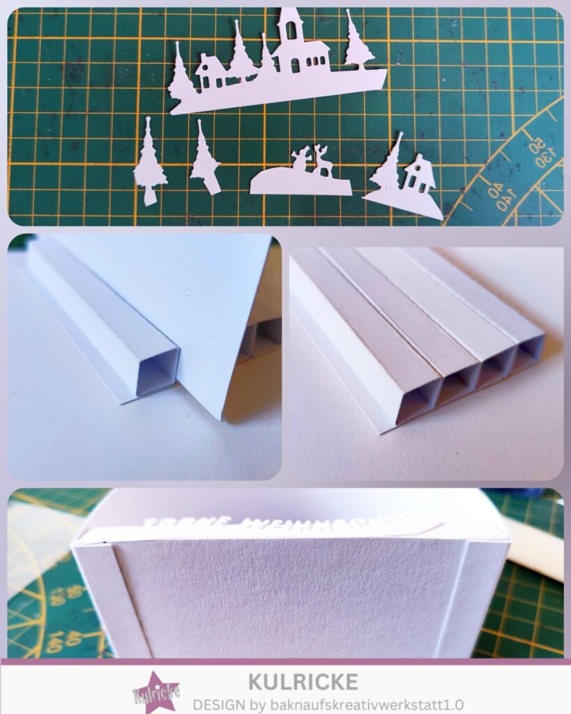 Ihr braucht vier Cardstock Stücke 10×4,9 cm, kurze Seite falzen bei 1/2/3/4 cm. Zusammen kleben. Diese vier Stücke auf den Boden (10×4,5cm) kleben. Kleber nur auf den Boden, man muss noch was dazwischen stecken können.
