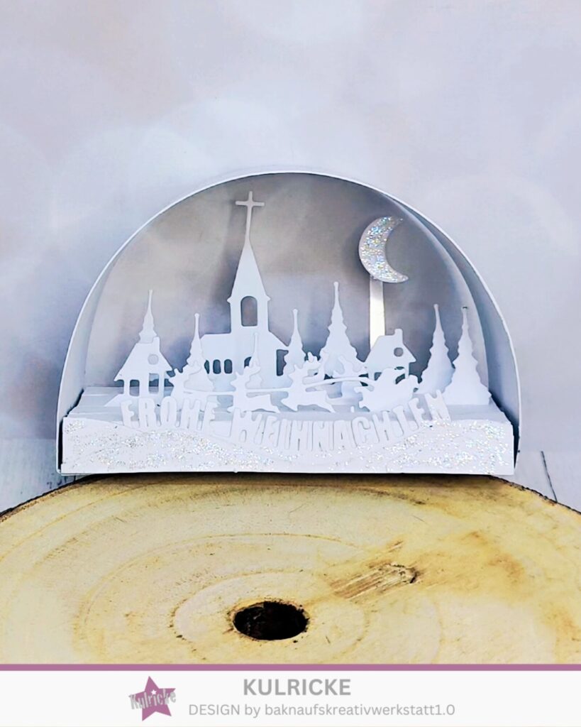 Für den Schwippbogen 21×4,5 cm Cardstock schneiden, rechts und links 1cm falzen und unter die Landschaft kleben. Auf diese Klebelasche noch einen Boden (10×4,5cm) kleben. Einzelheiten für das zusammen basteln sehr ihr auch auf dem Einzelheiten Bild.