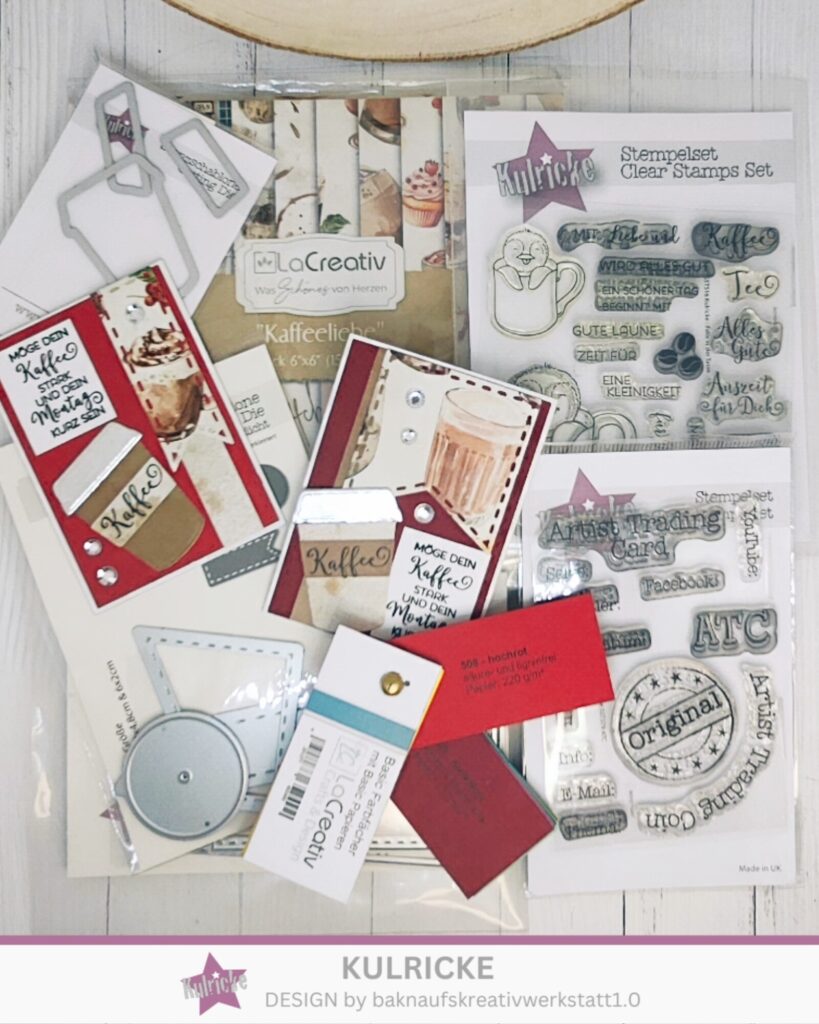 Ihr stanzt euch zwei ATC Grundkarten aus und bestempelt die Rückseite mit dem ATC Stempelset, Name, Datum, Serie ..