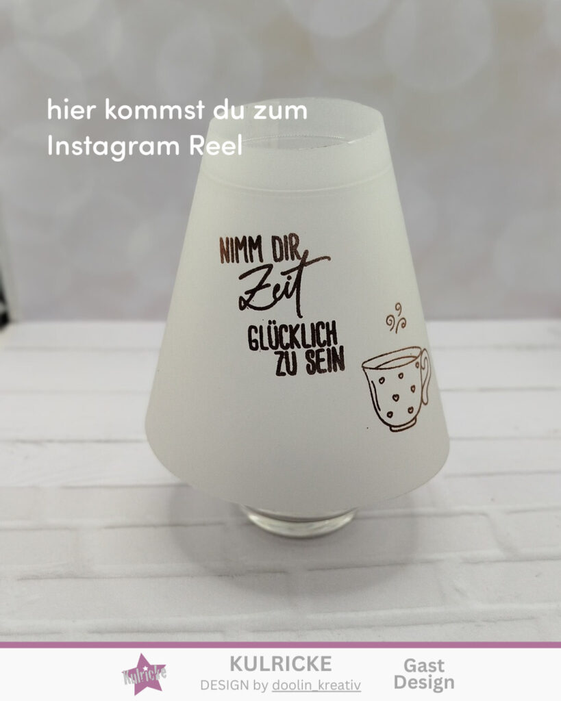 Heute möchte ich dir eine schöne Dekoration für die dunklen Tage zeigen. Aus dem Internet habe ich mir ein kostenloses Schnittmuster heruntergeladen (in die Suchmaschine Weinglas Lampenschirm eingeben). Dieses Schnittmuster ausgedruckt, auf Transparentpapier (Vellum) übertragen und zum Schluss mit Kleber zusammen geklebt. Als Licht habe ich ein elektrisches Teelicht benutzt. Auf dem Vellum habe ich dann die Stempelabdrücke mit Embossingpulver heiß emboost.