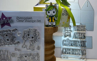 Anschließend habe ich mir aus Cardstock in Nachtblau einen Streifen mit den Maßen 6×10,5cm und mit einem Streifen Designpapier „Kakaoliebe“ in denselben Maßen beklebt. Bestempelt habe ich ihn mit einem Schriftzug aus dem Kulricke-Set „Adventslichter“.