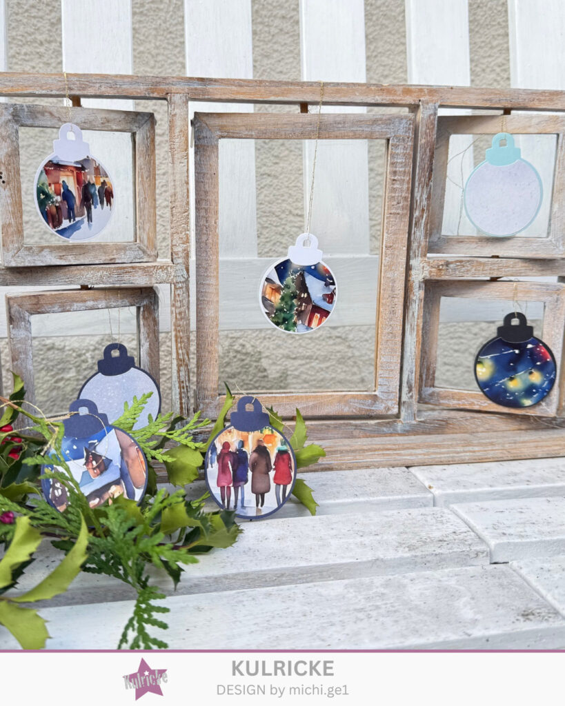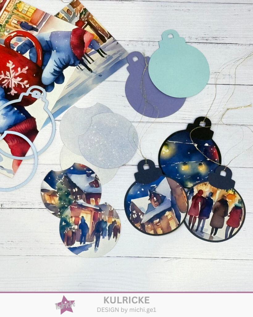 ausstanzen. Aus Designpapier Motive heraussuchen und die Kugel-Innenseite stanzen. Alles montieren und jeweils einen Faden befestigen.