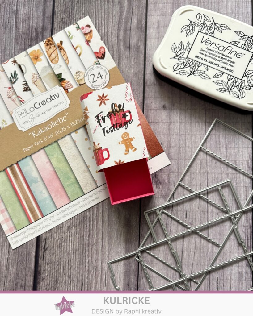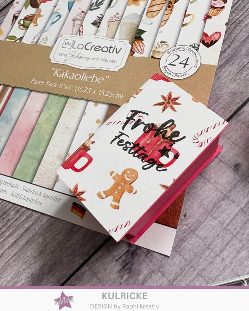 Anschließend habe ich mir aus Cardstock in Fuchsia einen Streifen mit den Maßen 6×10,5cm und mit einem Streifen Designpapier „Kakaoliebe“ in denselben Maßen beklebt. Bestempelt habe ich ihn mit einem Schriftzug aus dem Kulricke-Set „Adventslichter“.