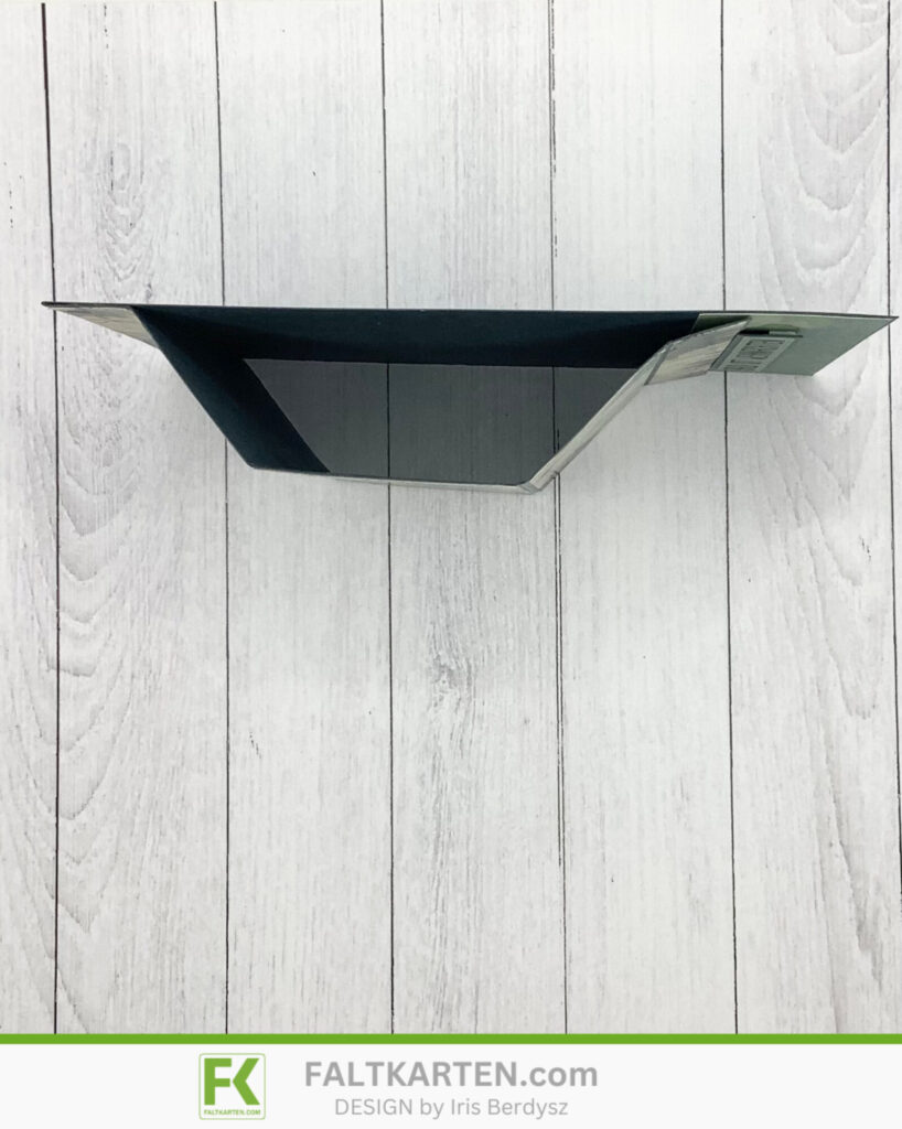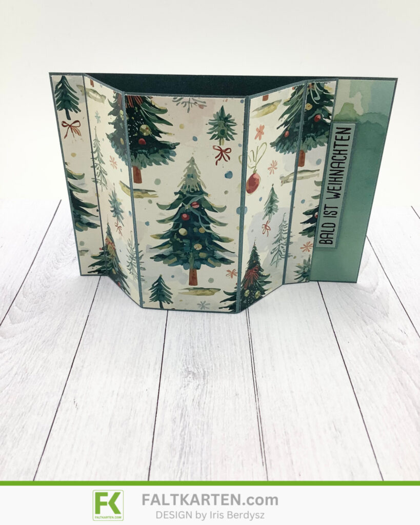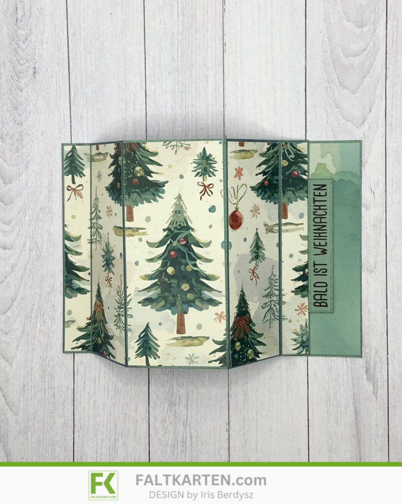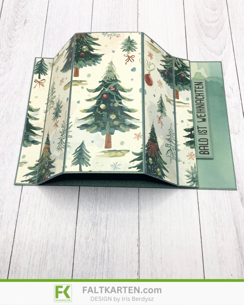 Ich habe hier einen halben DIN A4 Bogen des neuen Cardstocks Metallic grün gebraucht, das leider gerade ausverkauft ist. Den habe ich bei 1,5 cm, 5 cm, 9,8 cm, 13,3 cm und 14,8 cm gefalzt. Die Falzen knickte ich dann nach und schnitt das DSP zurecht.