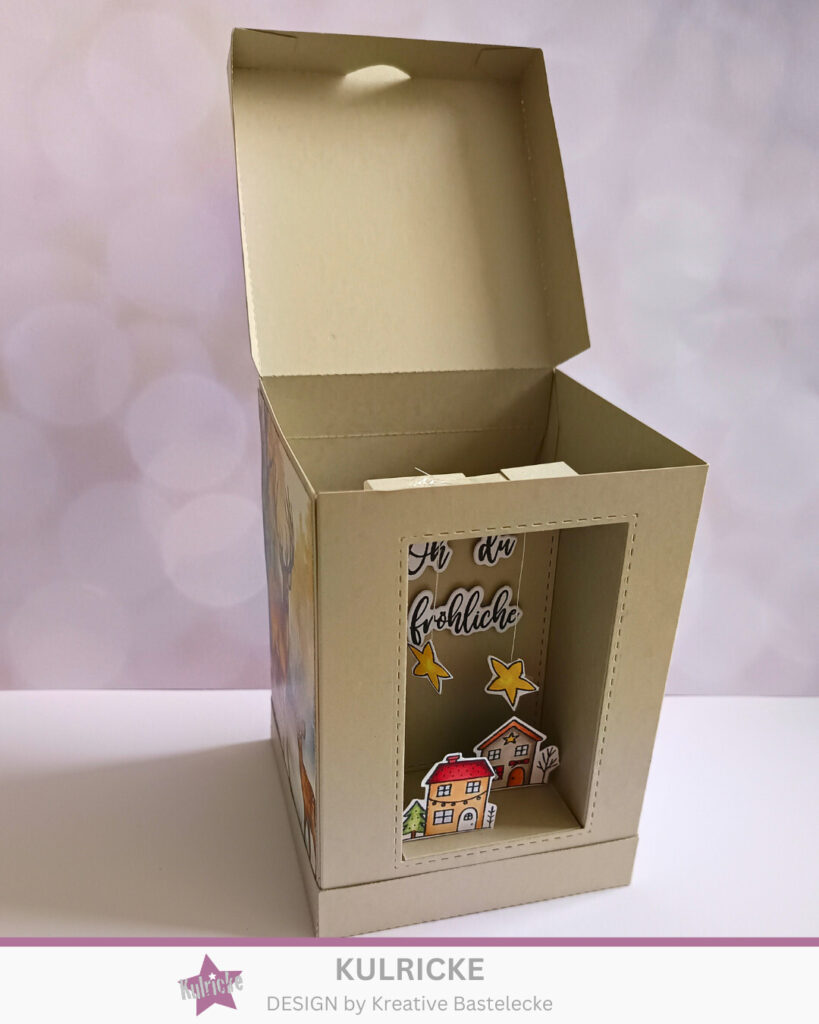 Den Innenbereich habe ich dann ebenfalls mit dem gleichen Cardstock verkleidet. Das Element reicht in meinem Fall 3 cm nach innen, auch dies könnt ihr ganz nach euren Bedürfnissen anpassen. Da die Auflegerstanze (wo das Fenster ausgestanzt hat) einen Innenteil beinhaltet, habe ich dies als Rückwand aufgeklebt, um somit einen schönen Abschluss zu haben.