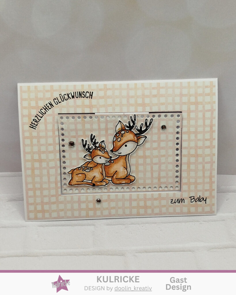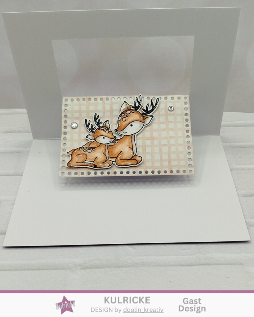 Heute zeige ich euch eine einfache Popup Karte. Zuerst klebt man das Papier auf die Karte und stanzt eine Form aus der Karte raus, die man dann später mit einem Steifen Innen wieder rein klebt. Die Rehfamilie habe ich mit Aquarellfarbe koloriert. Zum Schluss habe ich die Karte mit ein paar Steinchen aus meinem Bestand dekoriert.