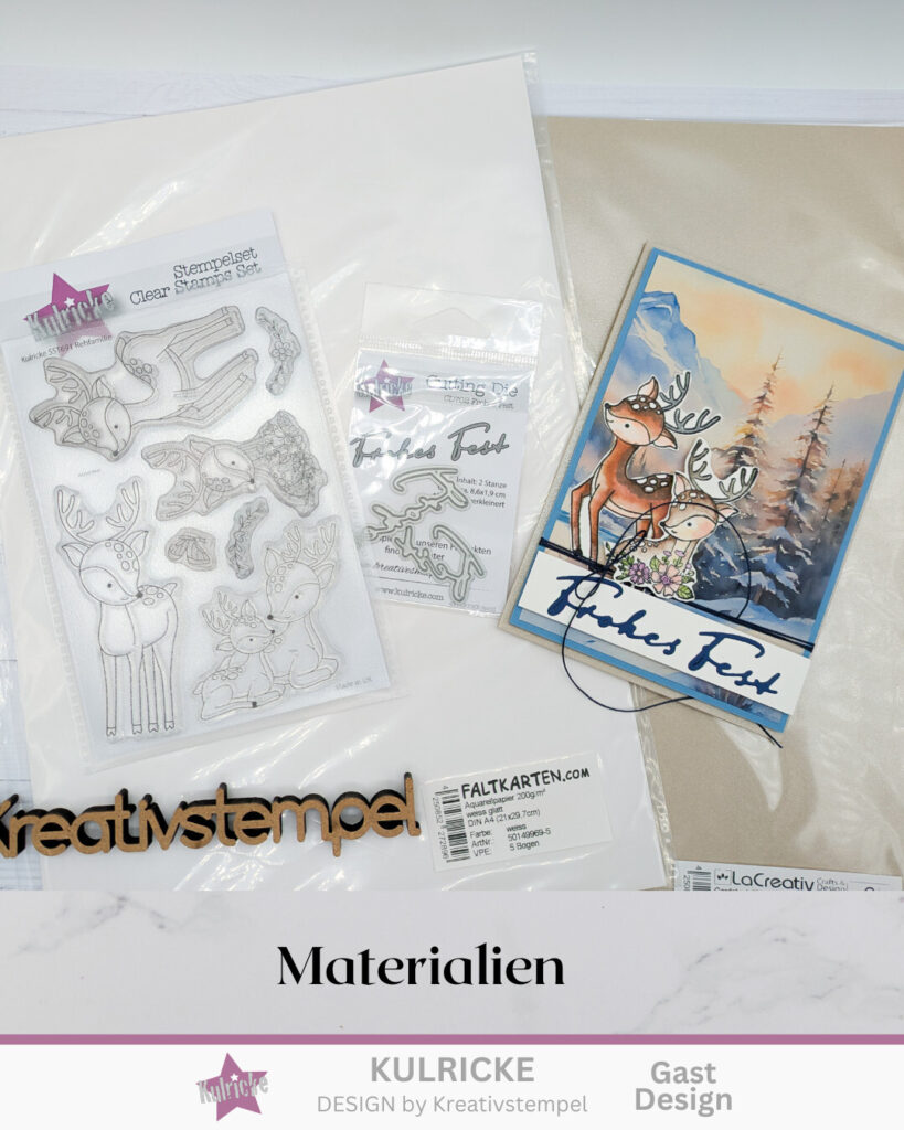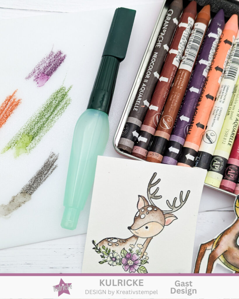 Nun könnt ihr die Stempelmotive aus dem Set Rehfamilie mit einem wasserfesten Stempelkissen in schwarz auf Aquarellpapier stempeln und anschließend mit den Distress Oxide Stempelkissen und Farben eurer Wahl kolorieren. Ich zeige euch dazu im Video einige Tips.