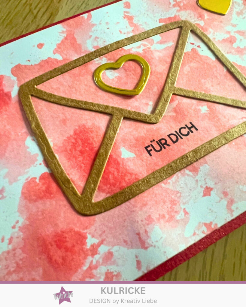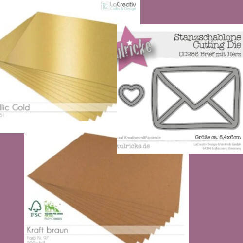 Während das Ganze trocknet stanzt Ihr Euch aus Kraftpapier sowie goldenem Papier den Briefumschlag sowie die Herzchen aus.