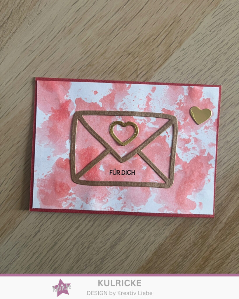 Ist alles gut durchgetrocknet klebt Ihr den Briefumschlag auf Euren Hintergrund und verziert ihn noch mit den Herzchen.
