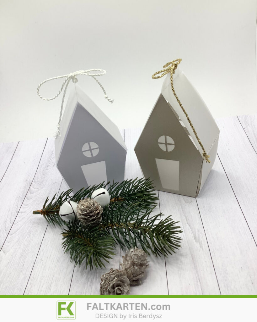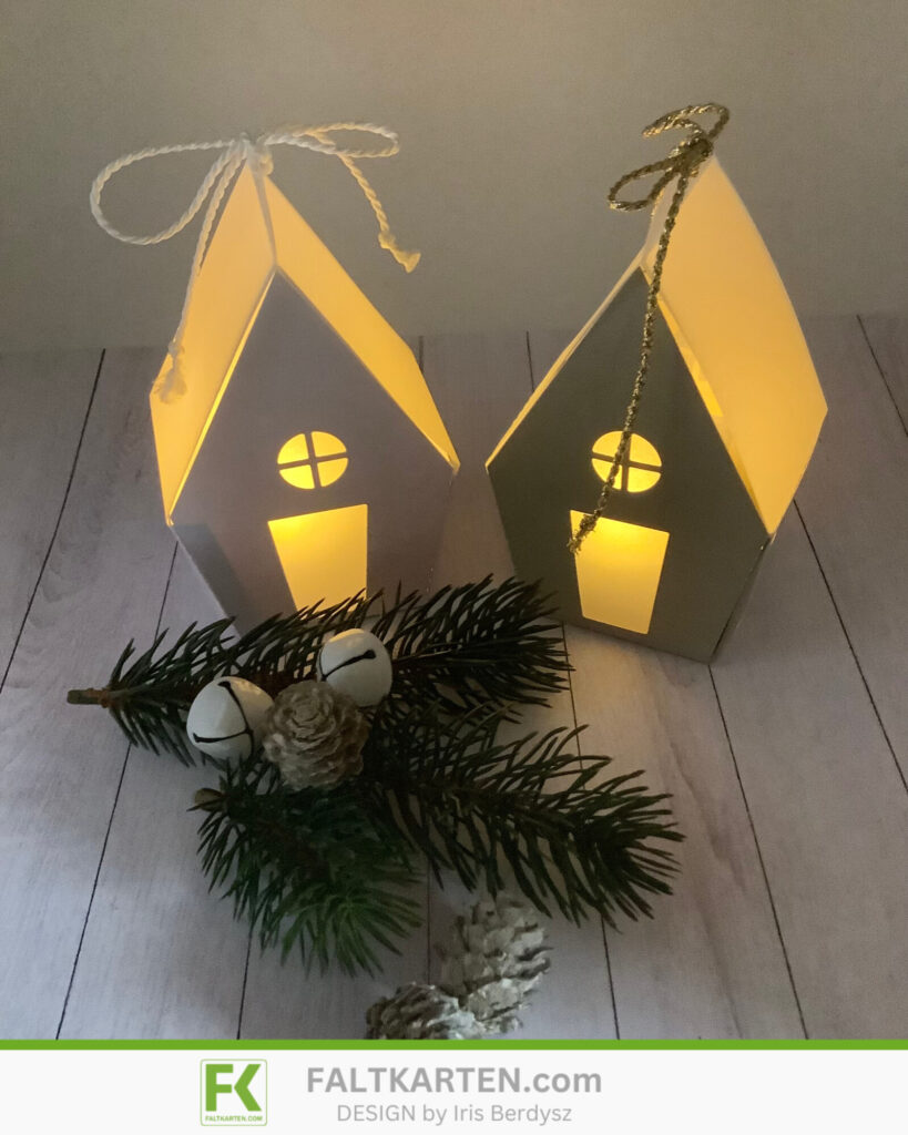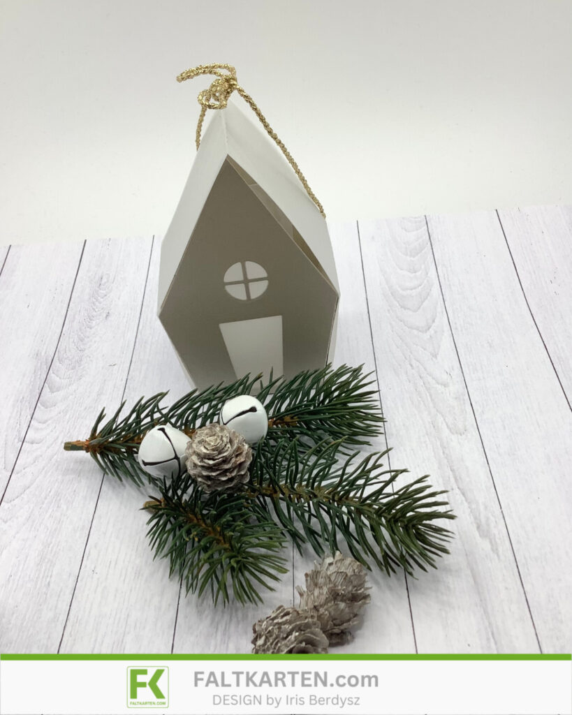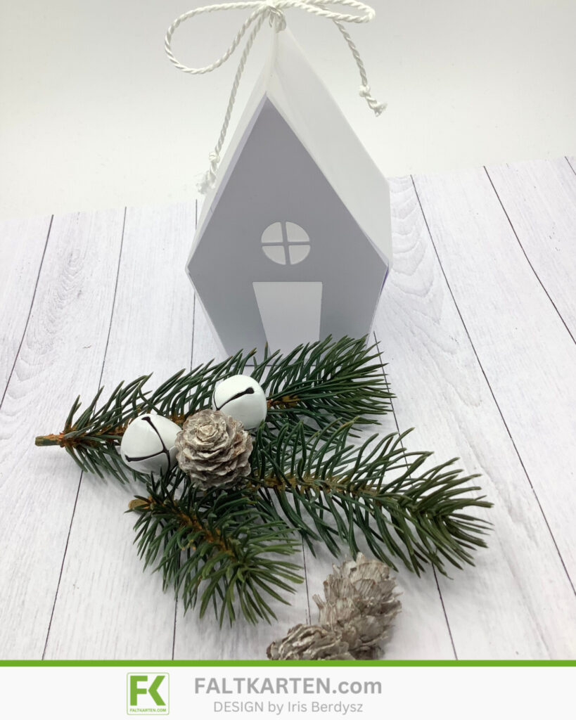 Das Haus klebte ich auf den Boden des Seitenstreifens und den wiederum klebte ich mit kleinen Klebepunkten an den Seitenteilen fest. Oben zog ich ein Band durch das Loch um das Dach schließen zu können, wenn ich ein elektrisches Teelicht hineinstelle.