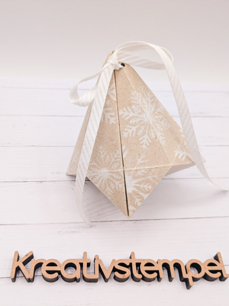 Mit dem Stempelset Weihnachtslabel einen Spruch stempeln, mit den passenden Stanzformen ausstanzen und dann auf der Schneeflocke platzieren. Zum Schluss auf die Pyramidenbox kleben und fertig.