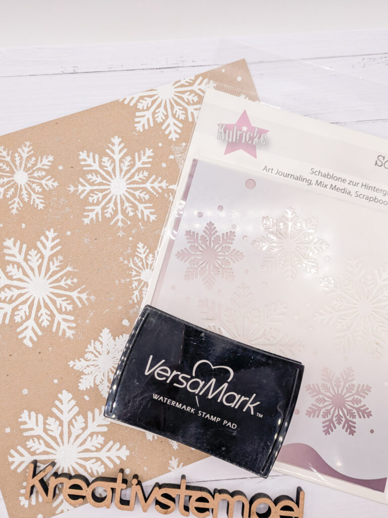 Alles was ihr dazu braucht ist ein quadratisches Stück Farbkarton, egel welche Größe. Es muss nur quadratisch sein. Ich habe mich für die Größe 21 x 21 cm entschieden. Den Farbkarton könnt ihr entweder mit Stempelmotiven verzieren, oder so wie ich mit Sternen embossen – zum Beispiel mit der Schablone Schneeflocken. Mehr dazu in meiner Video Anleitung, die findet ihr hier am Ende vom Beitrag.