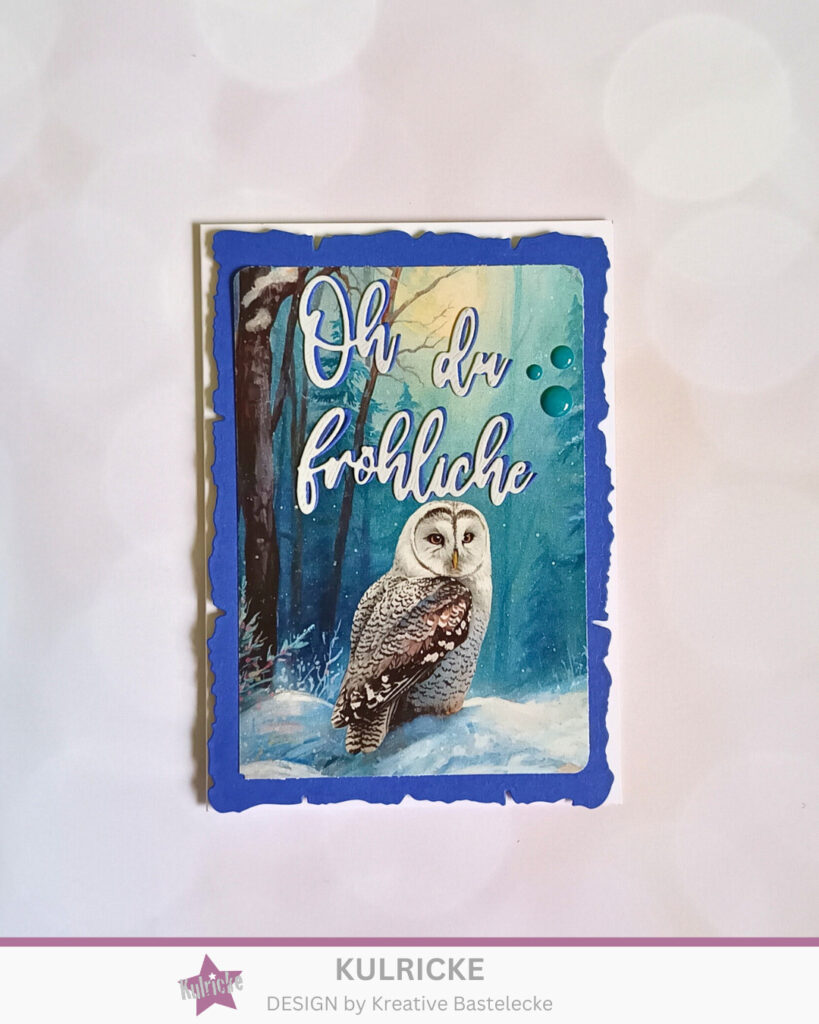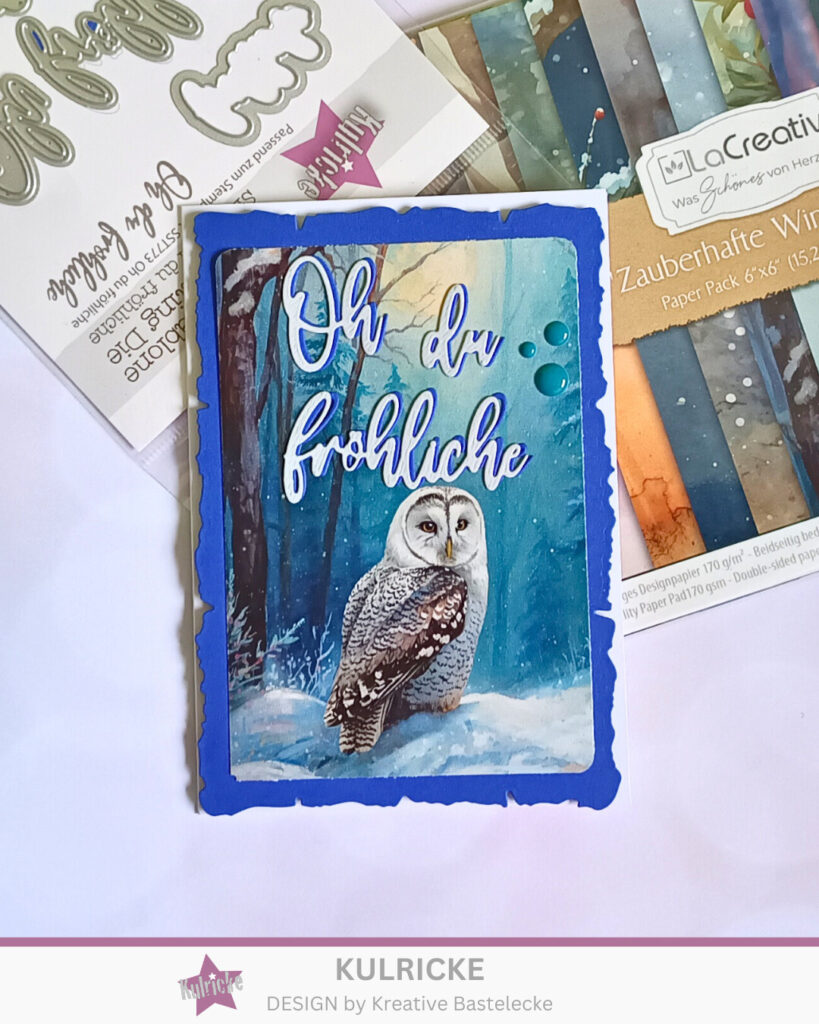 Das Designpapier Zauberhafte Wintereulen ist ja total meins. Ich liebe Eulen und wer das auch tut, der wird das DSP echt lieben! Aus dem Set habe ich mir die Eule ausgesucht, die im Schnee sitzt, mit einem schönen Baum an der Seite und dem Vollmond. Dazu eine weiße Kartenbasis. Gelayert habe ich dann die Basis, ein Cardstock in der Farbe ultramarin – welches ich mit der Stanze Aufleger-Büttenrand A6 bearbeitet habe und darauf die Eule.