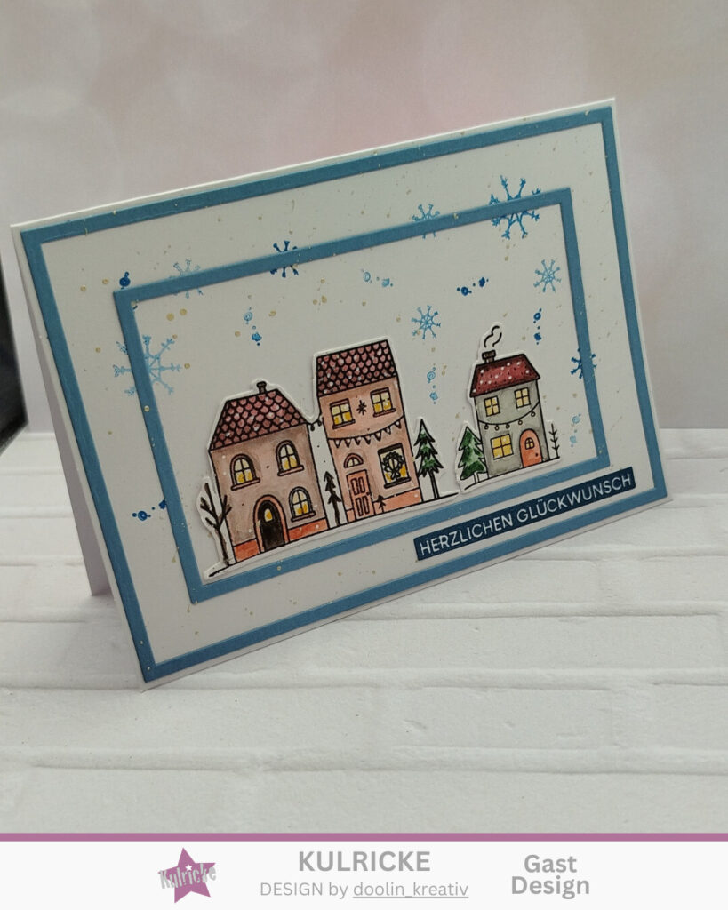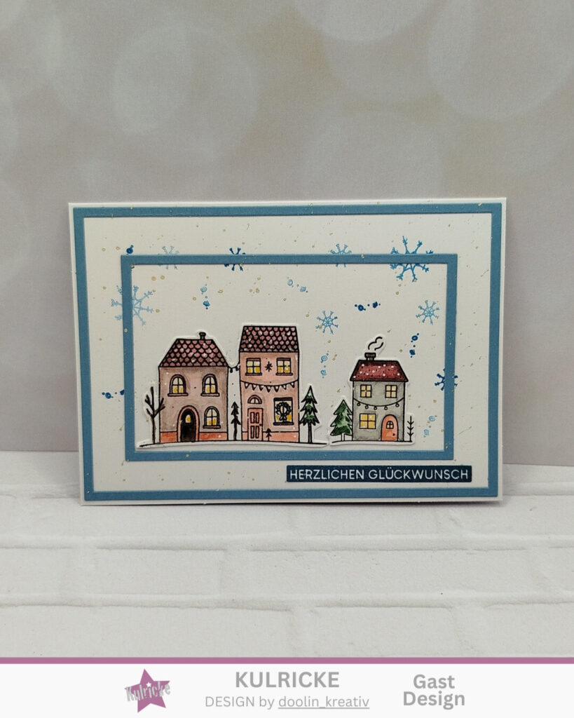 Bei meiner Winterhäuschen Karte habe ich die Rahmen / Rechtecke Stanze genutzt um den Häuschen einen Rahmen zu geben. Die Winterhäuschen habe ich mit Aquarellfarbe bepinselt. Einen Stempelspruch auf die Karte und fertig. Die Stempelsprüche mache ich mir immer auf Vorrat in verschiedenen Farben.